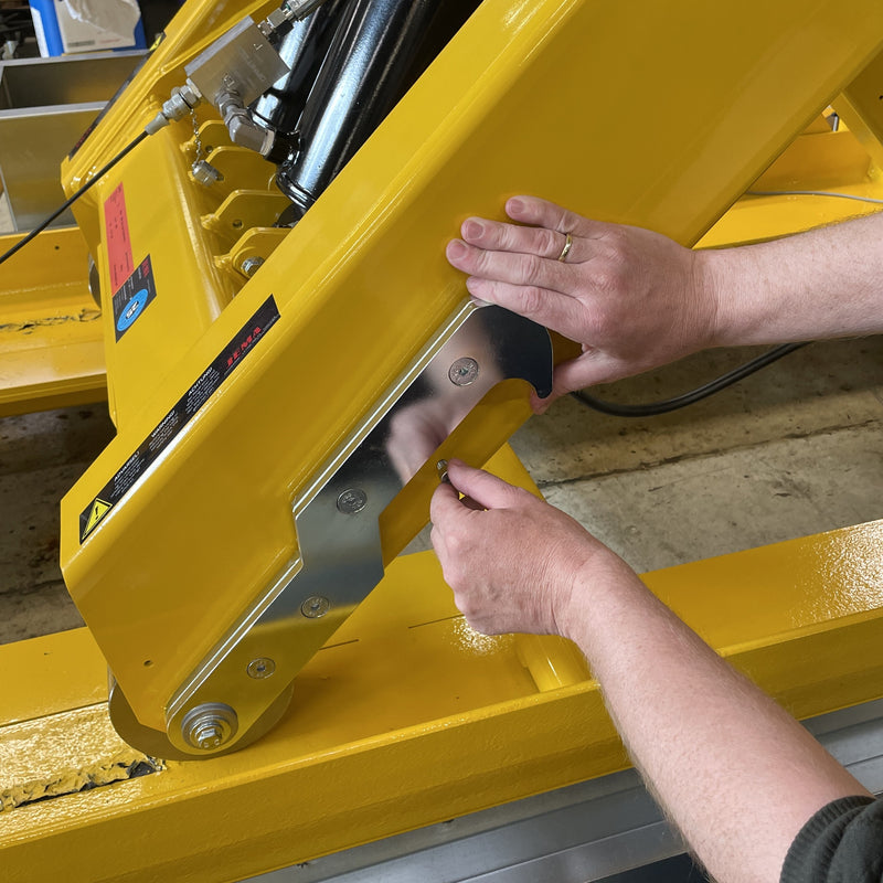 Det er sikkerhetsrammer på alle fire sider, og løftebordet er utstyrt med en ekstern strømforsyning, IP54-klassifisert, og ventiler med 24 V DC. Stålarmene er laget av høyfast stål med lange foringer og smørenipler for minimal slitasje – alt med tanke på lang levetid og lite vedlikehold.