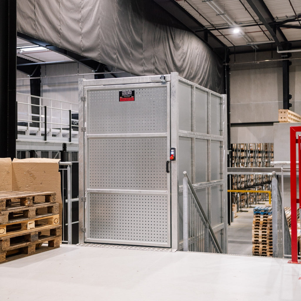 Bildet viser en vareheis i et distribusjonssenter der løftebordet brukes - men med en økning av bordplaten til 2500x1200 mm.